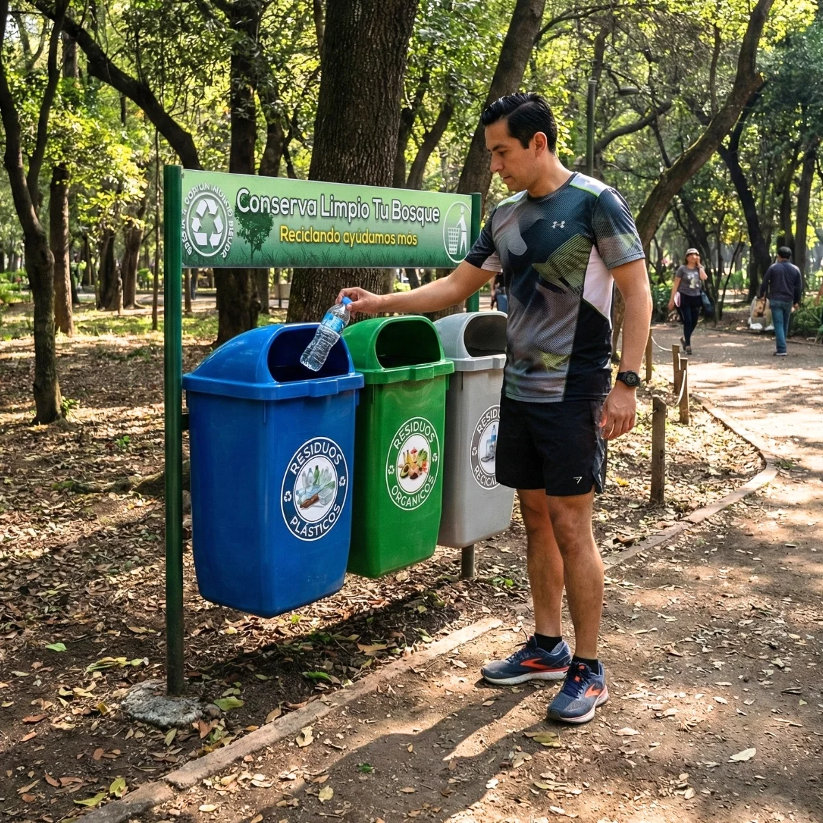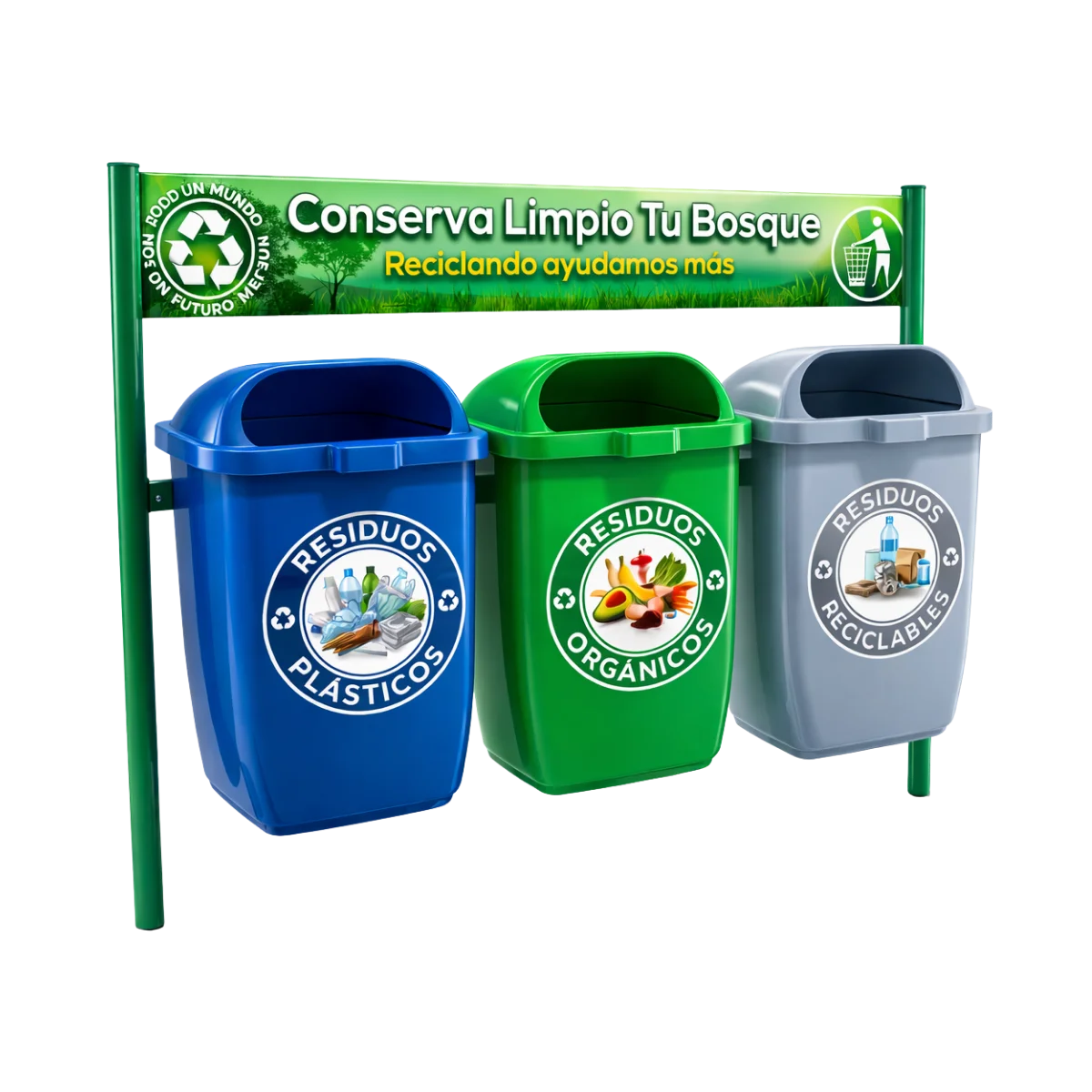 Bote de basura triple, es una estación de reciclaje que cuenta con una combinación de botes que permiten la separación adecuada de los residuos.