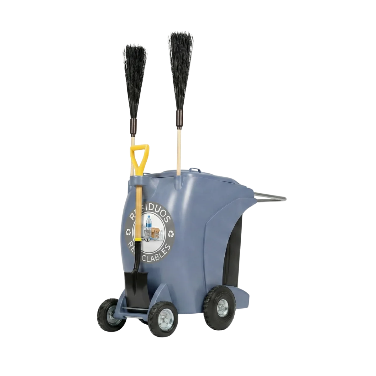 Los manubrios del carro están diseñados para un mejor control y manejo del mismo, mientras que su diseño le permite sostener en la parte frontal una pala y dos escobas para una mayor eficiencia en la limpieza vial.