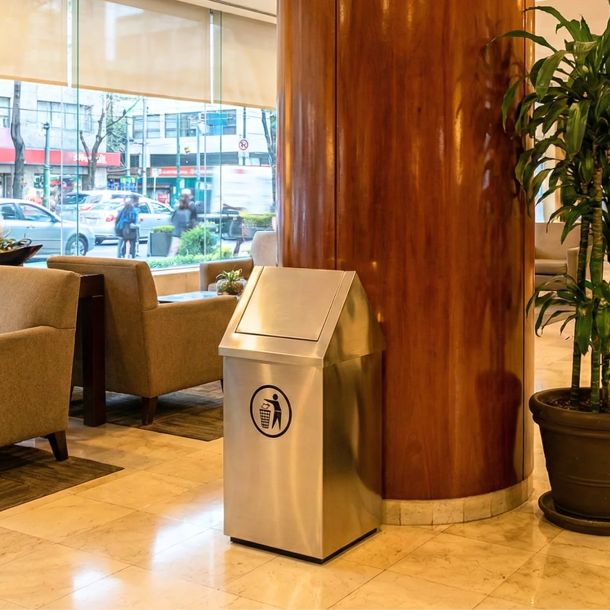 Además, la tapa permite una fácil disposición de desechos y al mantener si estructura movible evita que se visualicen los desecho en su interior, lo que se traduce en una vista elegante para su despacho o pasillo donde quiera colocarse.