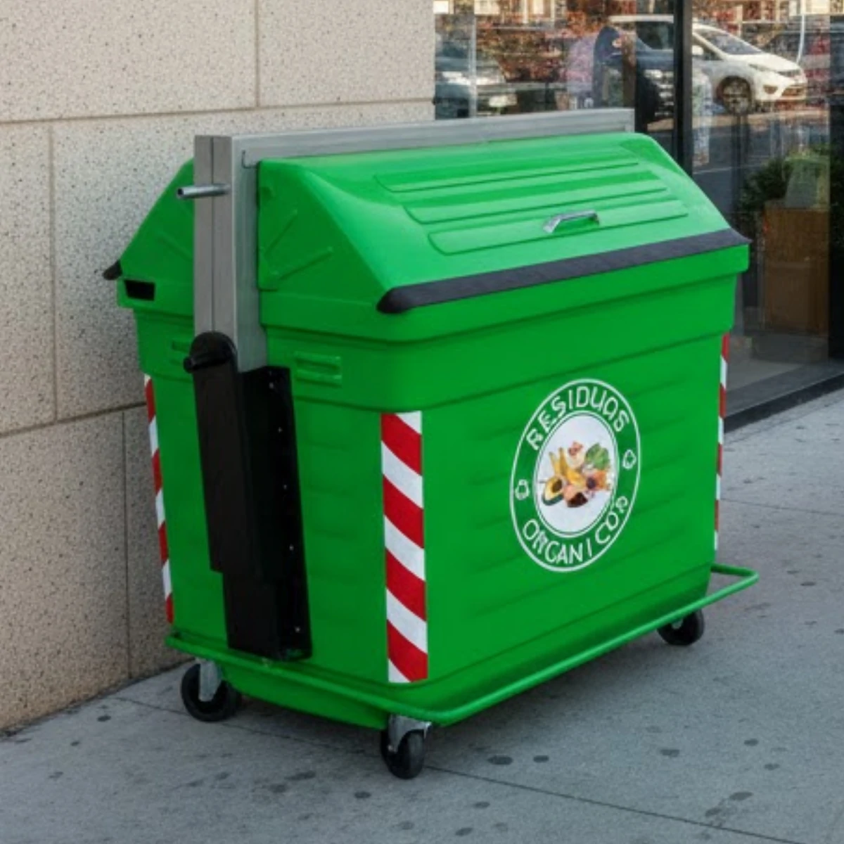 La funcionalidad del contenedor se adapta a diferentes necesidades: cuenta con opciones de vaciado por un lado para el usuario y por el otro para los camiones, compatible con cualquier sistema de elevación. Además, su diseño facilita la limpieza, manteniéndolo siempre en óptimas condiciones.
