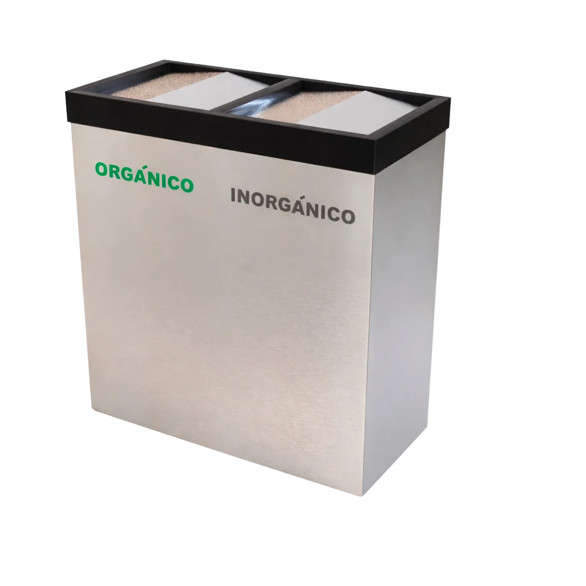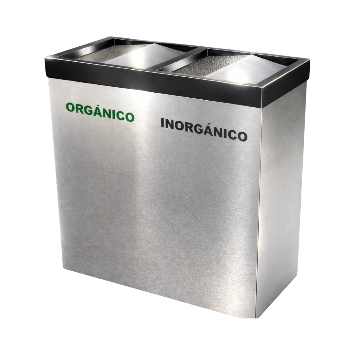 Además, su diseño rectangular doble permite separar fácilmente la basura orgánica de la inorgánica, lo que facilita el reciclaje y el manejo adecuado de los residuos.