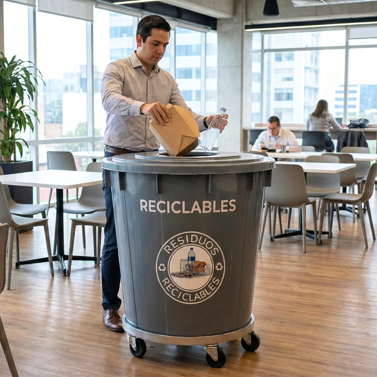 Para mayor comodidad, este contenedor ofrece la opción de incorporar cuatro ruedas giratorias de 4 pulgadas, que permiten un desplazamiento suave y sencillo. Ideal para espacios dinámicos donde el transporte rápido y seguro de residuos es fundamental.
